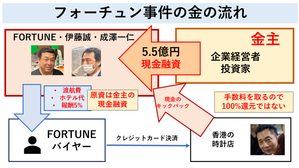 伊藤誠は、ロレックスの買い付け資金として現金を融資してくれれば、わざわざ香港に渡航しなくても報酬を支払うとバイヤーに提案し、バイヤーの中にはロレックスの買い付け資金として、現金を月利6%で中野正人に融資した人もいました。