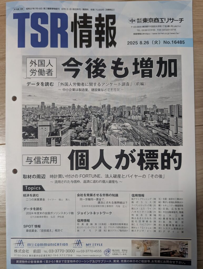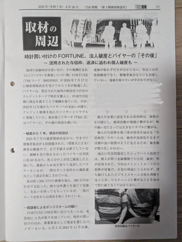 Line note 記事のタイトルとURLをコピーする 東京商工リサーチ TSR情報 2025 8.26(火)No.16485 株式会社FORTUNE破産申請が1年経過したことに伴い、再度、FORTUNE事件について記事に取り上げて頂きました。破産申請は債権者集会が4回開催され、現在も続行中のステータスです。 宮澤源二氏とは? 前の記事 東京商工リサーチ 次の記事